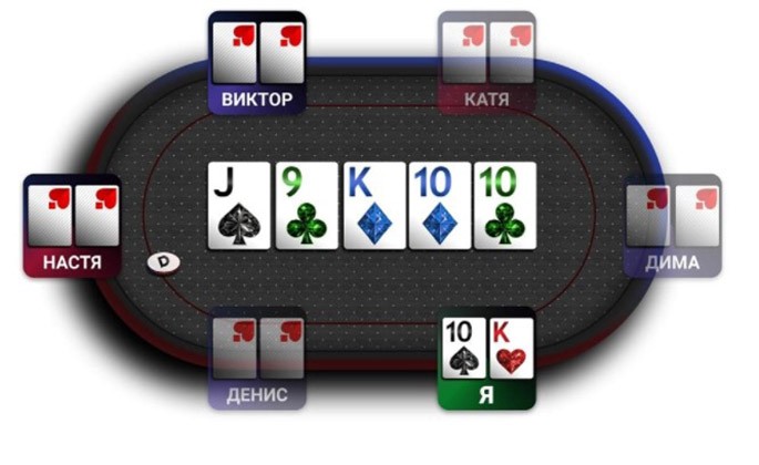 - У вас 9♥ 9♣, на столі 9♦ K♦ 9♠ 7♣ 2♣. Тоді найкраща комбінація – каре дев’яток (9♠9♣9♦9♥K♦).