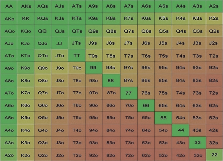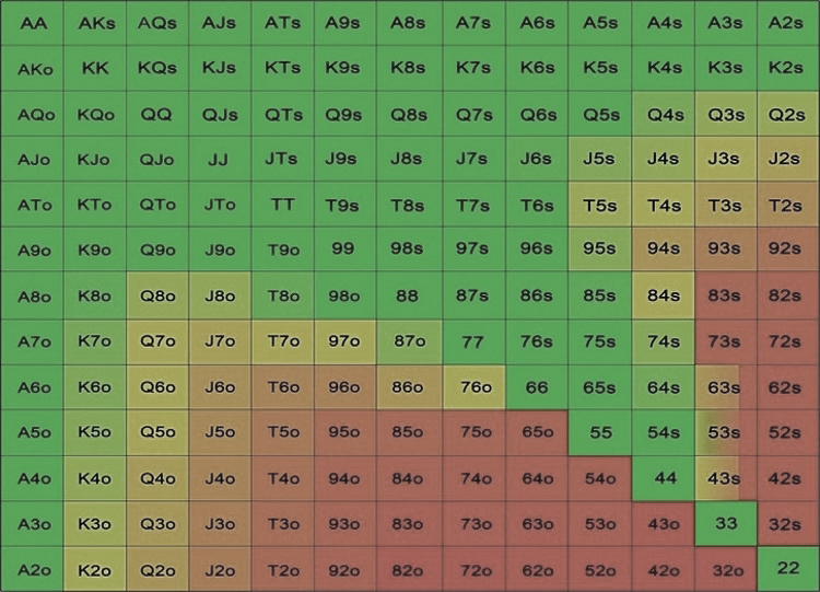 - Стек 10 блайндів: пушити варто сильні та середні діапазони – наприклад, від AA, KK, QQ, AKs, AQs до 99+ та деякі тузи із кікерами.